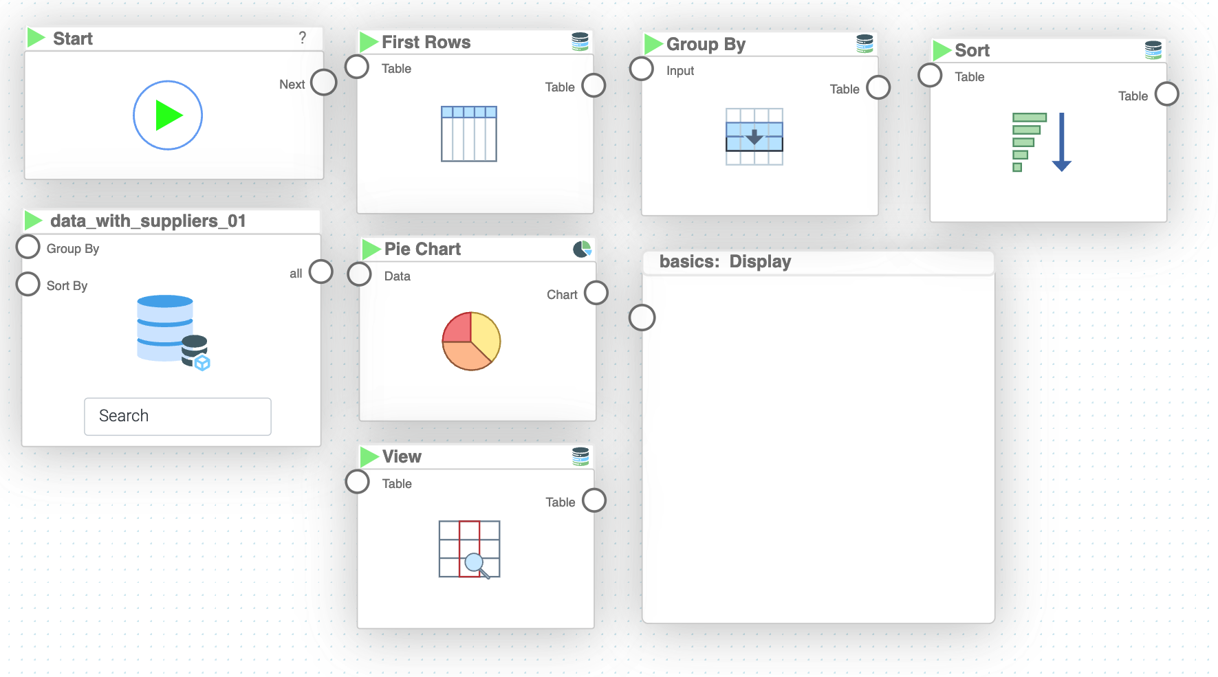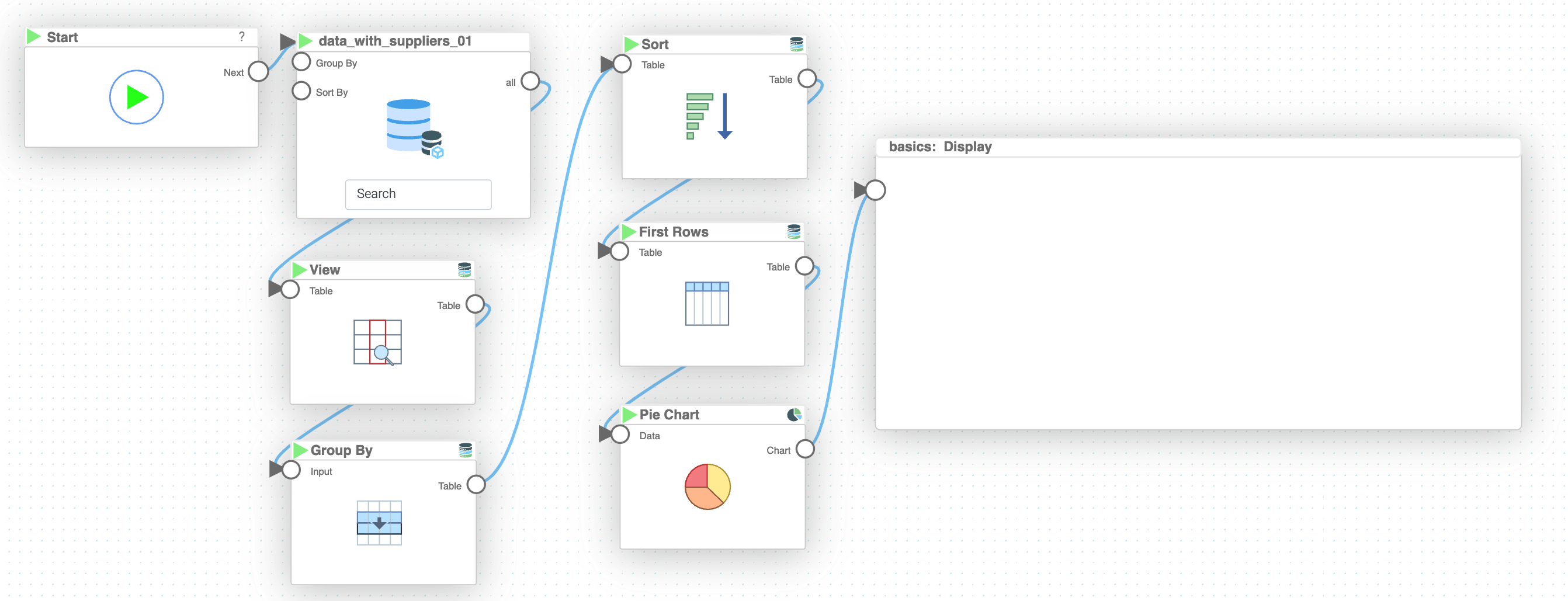 - Connect the "Start" BLOX to the "MyData" BLOX, "MyData" to "View" BLOX, "View" to "Group By" BLOX, "Group By" to "Sort" BLOX, "Sort" to "First Rows", "First Rows" to "Pie Chart" BLOX and finally "Pie Chart" to "Display"