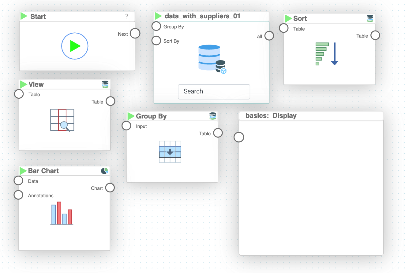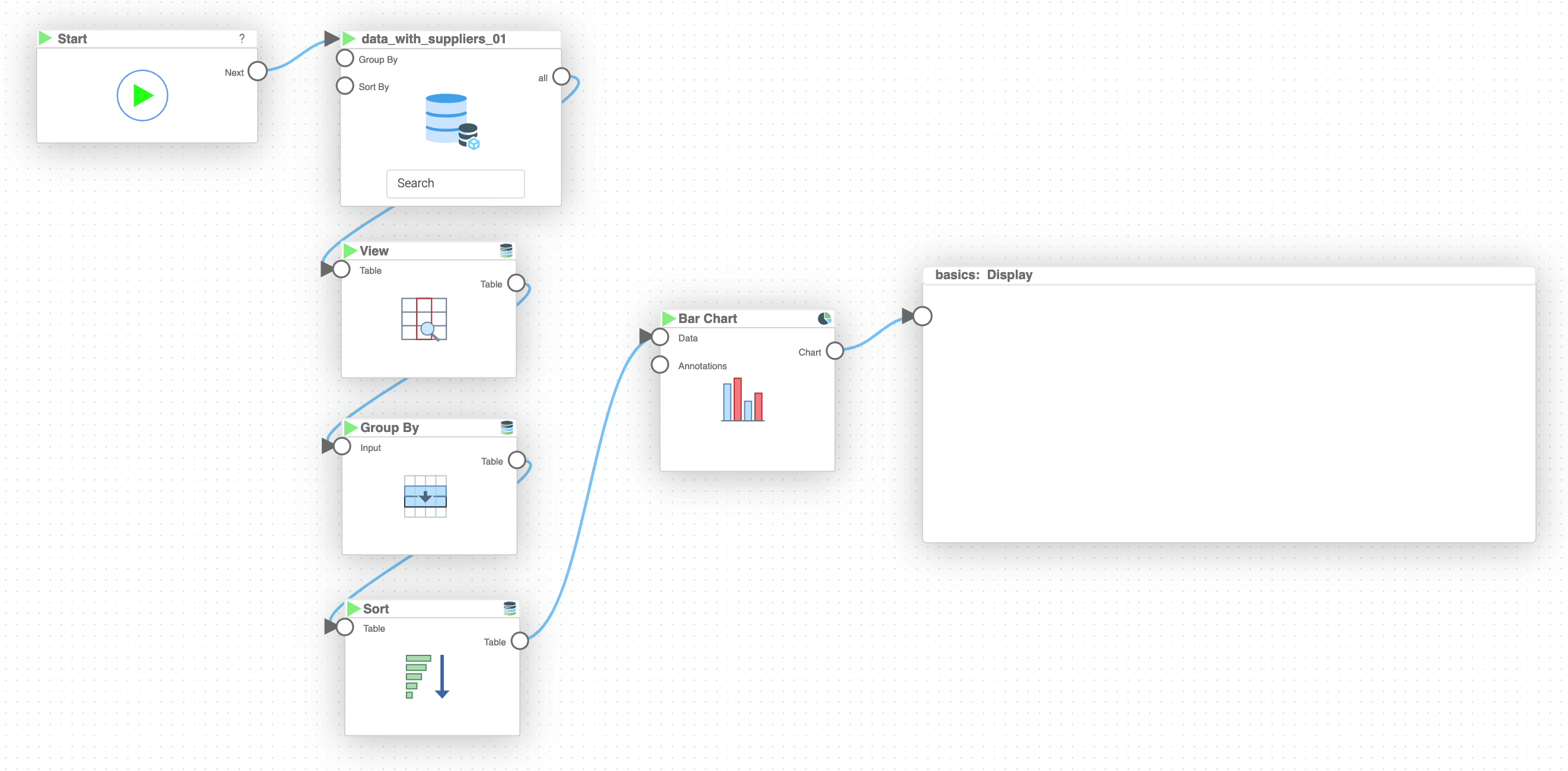 - Connect the "Start" BLOX to the "MyData" BLOX, "MyData" to "View" BLOX, "View" to "Group By" BLOX, "Group By" to "Sort" BLOX, "Sort" to "Bar Chart" BLOX and finally "Bar Chart" to "Display"