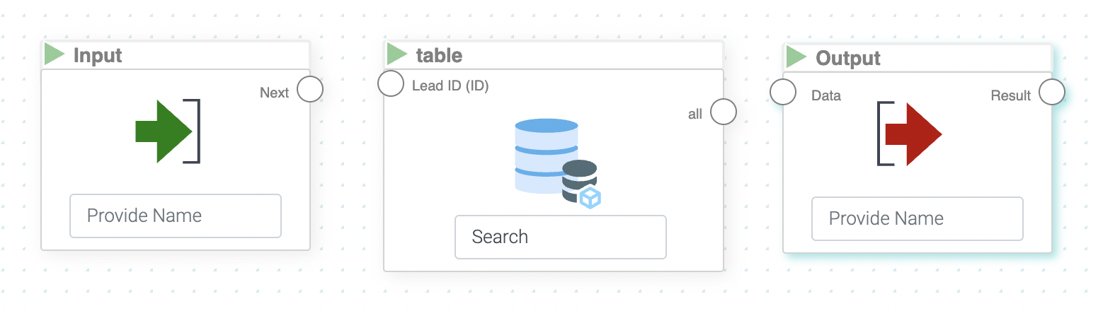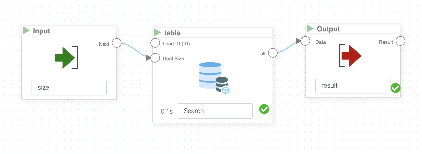 - Connect the MyData with an Output BLOX and give it also an name. You can test run the flow. The Flow gives you all entries from the database with a deal size over e.g. 500.